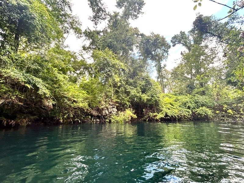 Is it not uncommon to see a green layer of duckweed floating on the surface of the Orange Grove Sink. The north wall of the sink is nearly vertical and slopes slightly inward, making it an ideal location for divers to explore.