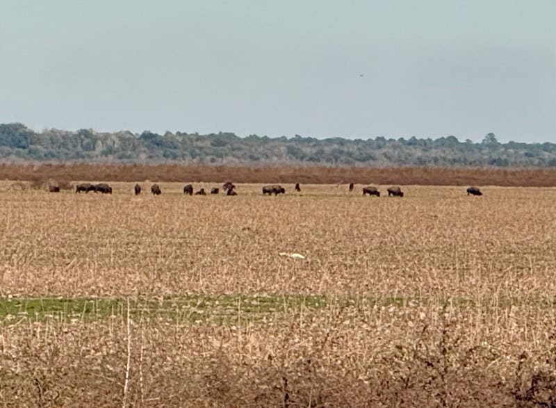 In 1974, Paynes Prairie was designated Florida’s first State Preserve. As part of restoring the prairie’s original ecosystem, the state decided to reintroduce native megafauna. In 1975, A small herd of American bison was reintroduced to Paynes Prairie. The animals were brought from western U.S. herds with genetics suitable for conservation herds. They were placed in a free-ranging, fenced preserve that mimics historic prairie conditions.